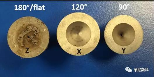 入口角對(duì)毛細(xì)口模入口處熔體的流動(dòng)規(guī)律有影響。進(jìn)口角較低的模具,減少了再循環(huán)角渦的形成,降低了口模進(jìn)口的不穩(wěn)定流動(dòng)和能耗。較低的角度有利于剪切流動(dòng),降低了聚合物熔體的彈性變形。單尼斯科提供了60°(W)、90°(Y)、120°(X)、180°(Z)四種入口角度的毛細(xì)管口模,下圖為三種不同入口角度的口模。